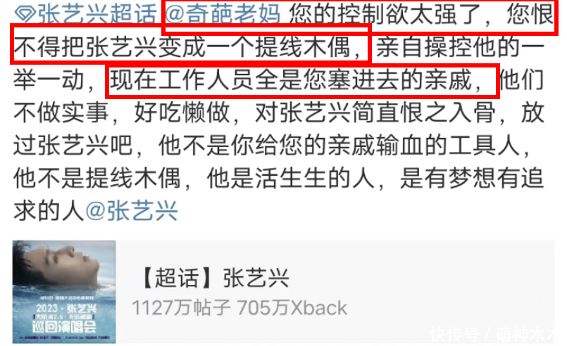 周边张艺兴演唱会,又曝出了张艺兴职责室抄袭粉丝海报事件,成了压垮骆驼的终末一根稻草,不少业内王人站出来爆料了张艺兴职责室的仙葩活动,越来越多粉丝加入维权行列,条目把张艺兴亲妈安插在张艺兴身边的九故十亲一起开除,号称另类版“婆媳大战”——粉丝和亲妈胜仗对上了!